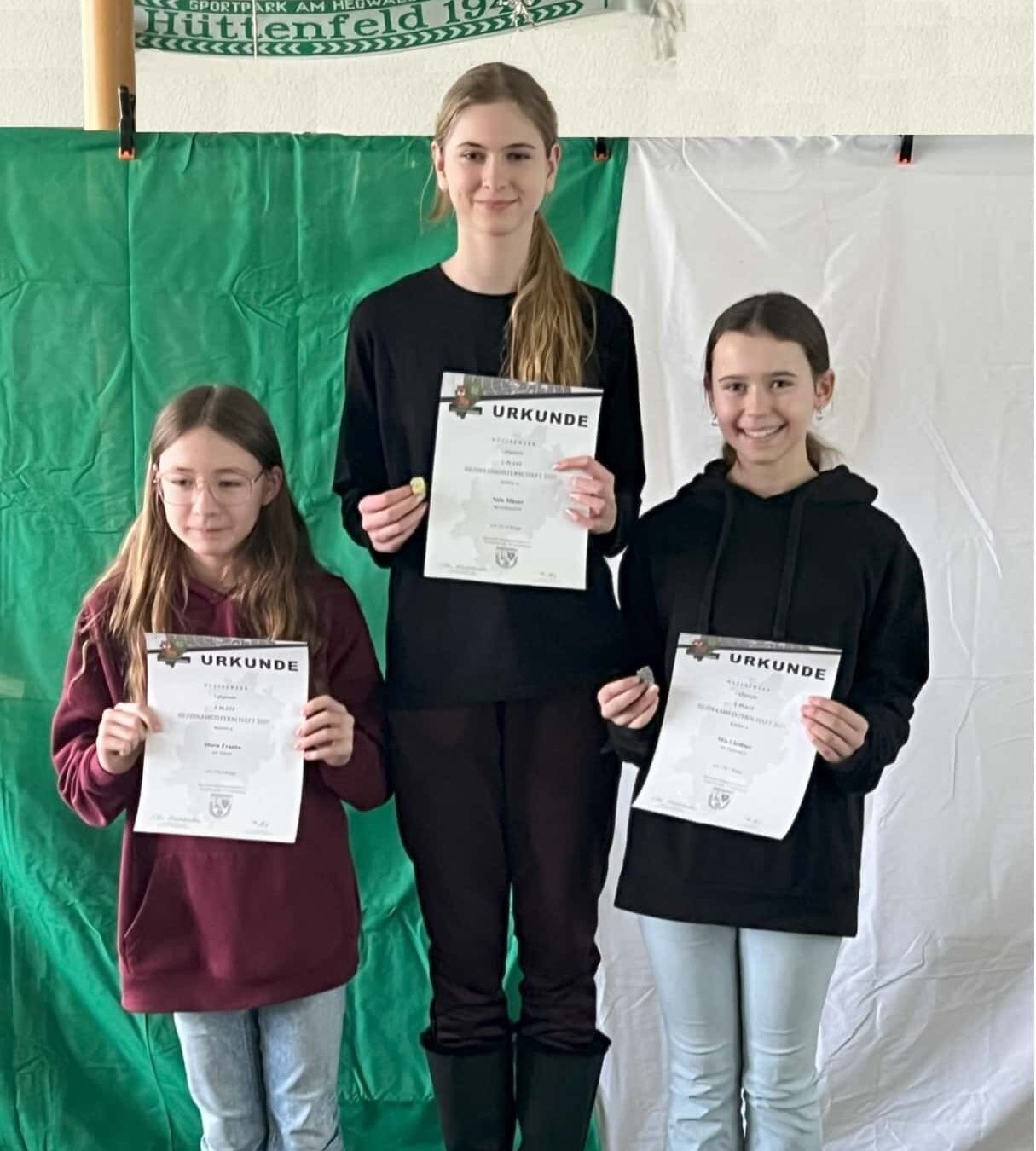 Mit der Luftpistole wurde Gabriele Jankeviciute mit guten 340 Ringen Siegerin bei der weiblichen Jugend. Mit dem Luftgewehr in der Schülerinnenklasse kam Nele Mayer mit 181,9 Ringen erwartungsgemäß auf Platz 1 vor ihrer stark aufschießenden Mannschaftskollegin Mia Gleißner, die 178,7 Ringe für sich verbuchte. Zusammen mit Oskar Hilbert, der mit 162,6 Ringen den Titel in der Schülerklasse für Hüttenfeld holte, wurden die beiden Mädels auch Mannschaftsmeister in der Schülerklasse. In der Jugendklasse weiblich brillierte Viktorija Behrendt mit sehr guten 391,8 Ringen und sicherte sich damit die Meisterschaft. Bei den Junioren II wurde Lyon Mayer mit 386,5 Ringen Bezirksmeister. Seine Mannschaftskollegen Erik Mehner und Lukas Thiede kamen mit jeweils 381,4 Ringen auf die Plätze 3 und 4, wobei die Platzierung anhand der letzten Serie entschieden wurde. Die Auswertung fiel mit 97,1 : 91,6 Ringen zu Gunsten von Erik aus. In der Mannschafswertung kamen die drei Jugendlichen mit 1149,3 Ringen souverän auf Platz 1. Bei den Juniorinnen II war es Timea Schneider, die sich mit 389,1 Ringen den Siegertitel holte. Mannschaftskollegin Josephine Jöst kam mit 375,4 Ringen auf Platz 5. Trinity Eckhardt startete in der Klasse Juniorinnen I und kam dort mit 374,4 Ringen auf den undankbaren vierten Platz. Gemeinsam wurden Hüttenfeld Juniorinnen in der Mannschaftswertung am Ende zweite.